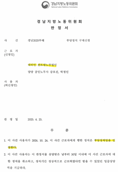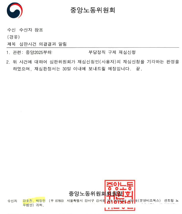 센트럴노무법인은 2025. 1.부터 2025. 9.까지 A공사 근로자를 대리하여 부당정직 구제신청 지방노동위원회 인용, 중앙노동위원회(사용자 재심)기각 판정을 이끌어냈습니다.